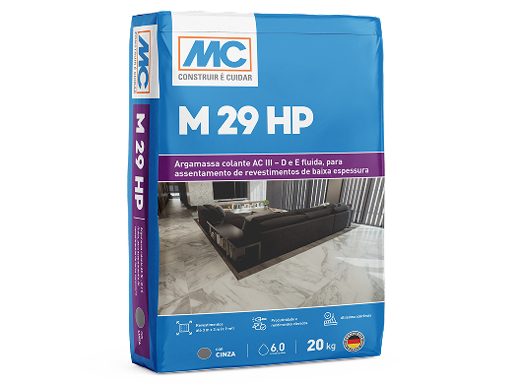 Projetado para o assentamento de revestimentos de baixa espessura em áreas internas e externa, o M 29 HP da MC-Bauchemie é uma argamassa colante AC III-D e E fluida. O produto é adequado para o assentamento de revestimentos de até 3 m x 3 m (≤ 9 m²).
