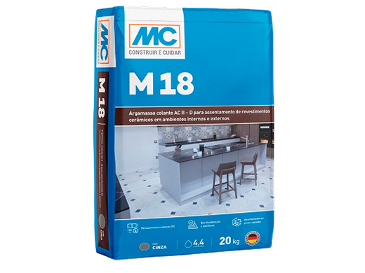 O M 18 da MC-Bauchemie é uma argamassa colante AC II-D cinza, desenvolvida para o assentamento de revestimentos cerâmicos em áreas internas e externas. O produto MC permite acomodar pequenas movimentações da estrutura, evitando o descolamento das peças e garantindo uma fixação segura.